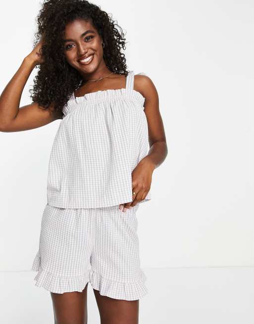 JDY - Smock-top med tekstur og cami-stropper med bindebånd i cremehvidt tern - Del af sæt