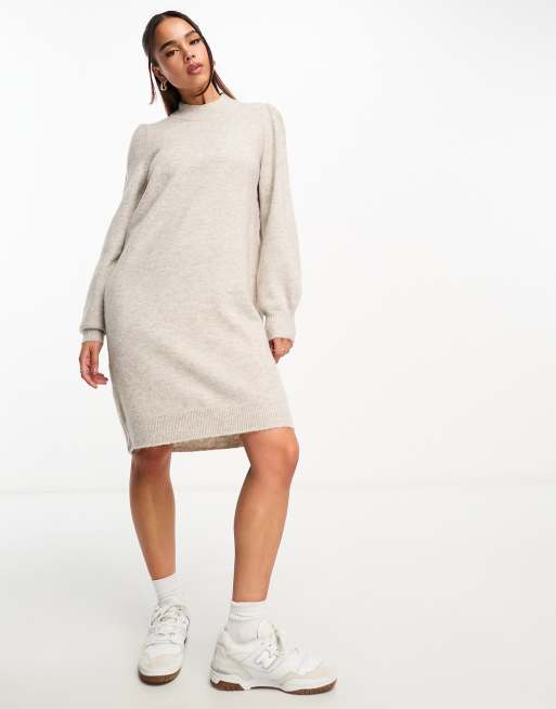 JDY - Strikket mini-sweaterkjole med pufærmer i beige strik