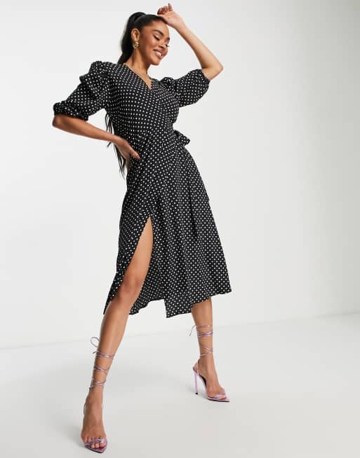 John Zack - Slå-om-midikjole i sort med polkaprikker