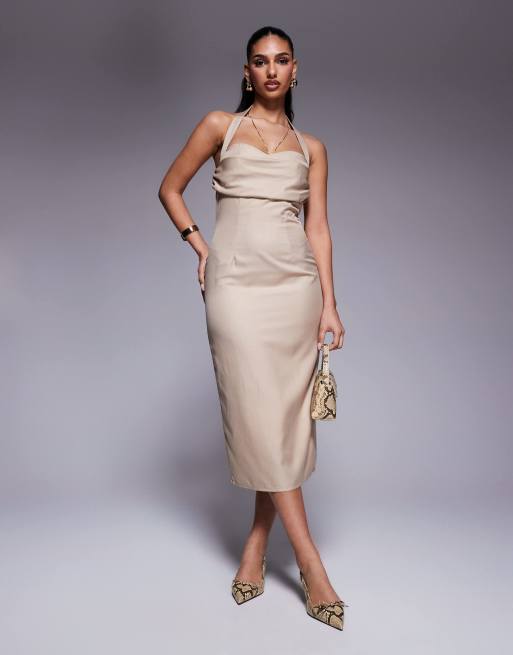 Kaiia - Beige skræddersyet midaxi-kjole med draperinger over brystet, halterneck, åben ryg og nålestriber