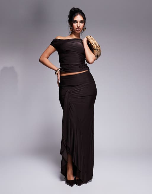 Kaiia - Chokoladebrunt sæt med asymmetrisk tætsiddende offshoulder-top og draperet maxinederdel