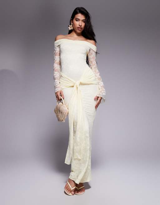 Kaiia - Citrongul tætsiddende bardot-maxikjole i dobbeltlag med blondestof og draperet bindedetalje i taljen - Kun hos ASOS