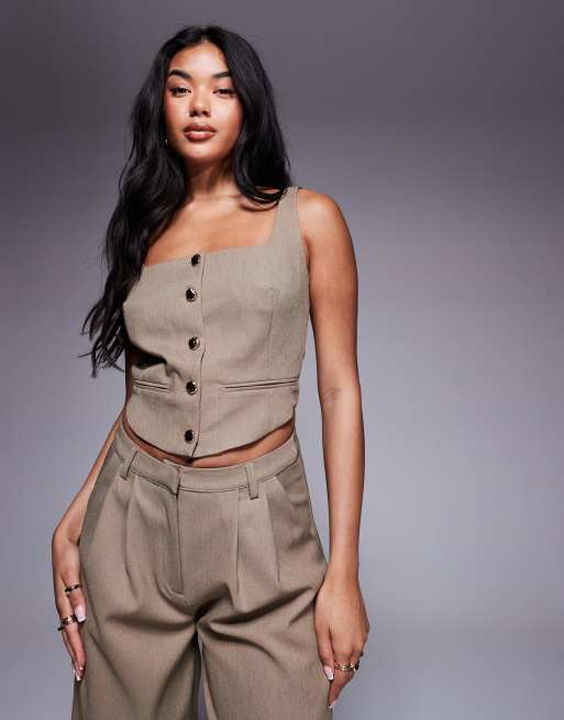 Kaiia - Forvasket brunt habitvestetop med firkantet hals og hamrede guldknapper foran - Del af sæt - Kun hos ASOS