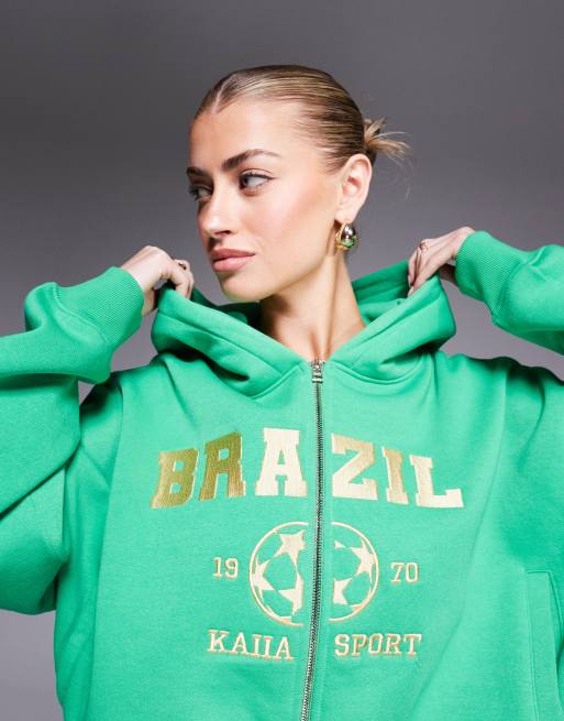 Kaiia - Grøn hættetrøje med lynlås og gult 'Brazil'-print i bomuldsblanding - Del af sæt