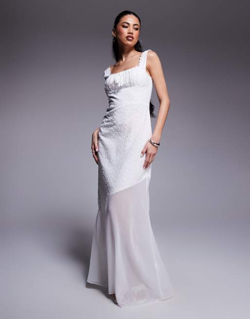 Kaiia - Hvid maxikjole med bindedetalje på brystet og asymmetrisk gennemsigtig kant i bomuld i broderie anglaise - Kun hos ASOS