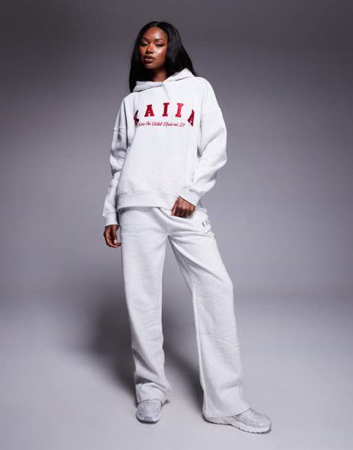 Kaiia - Lysegråmeleret/rødt sæt med hættetrøje, cropped T-shirt med broderet logo og joggingbukser med vide ben