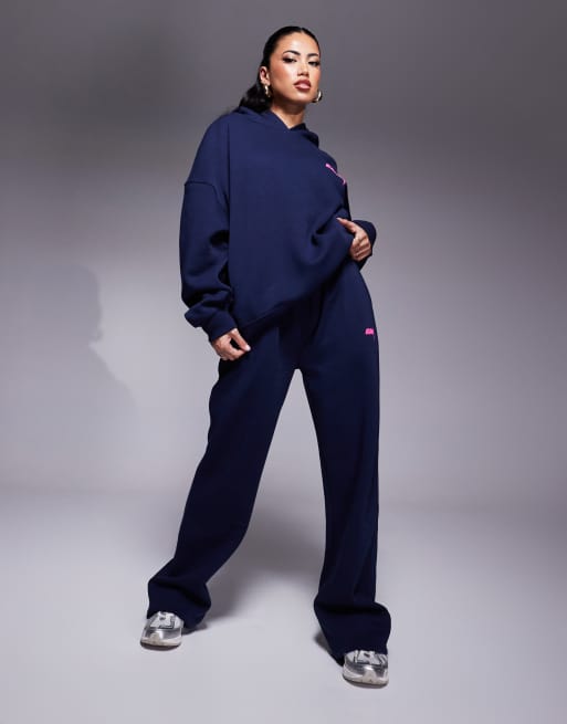 Kaiia - Marineblåt sæt med hættetrøje med logo og bølget print på ryggen og joggingbukser med vide ben