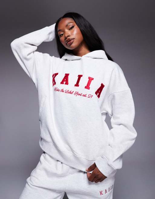 Kaiia - Meleret lysegrå bomuldsrig oversized hættetrøje med rødt logobroderi - Del af sæt