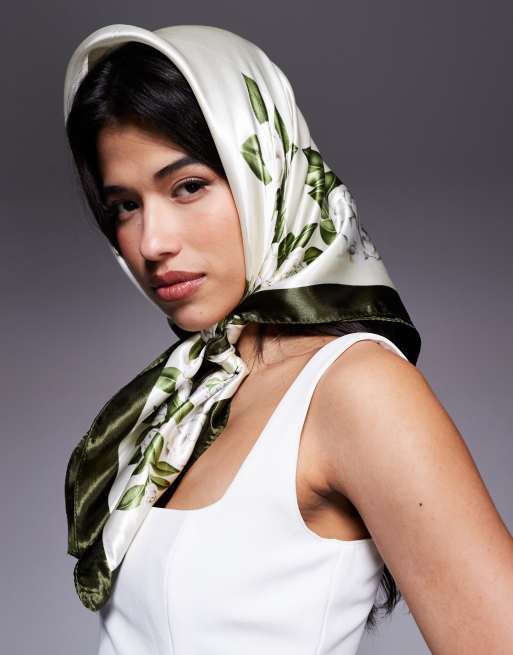 Kaiia - Olivengrønt og cremehvidt hovedtørklæde med blomstermønster i satin - Kun hos ASOS