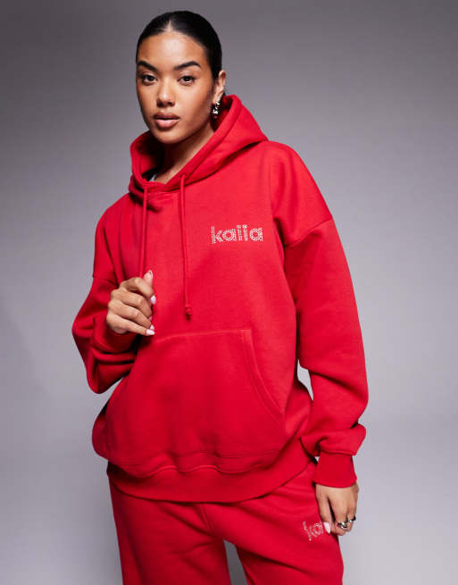 Kaiia - Oversized og bomuldsrig rød hættetrøje med rhinstens-logo - Del af sæt - Kun hos ASOS