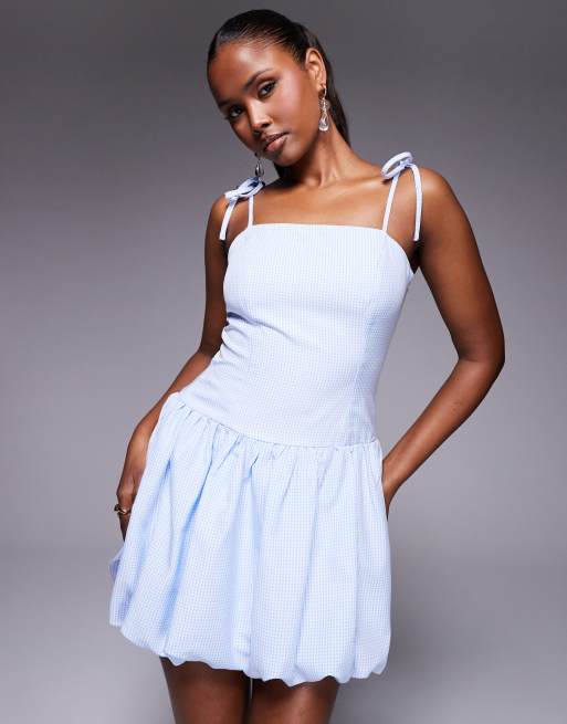 Kaiia - Puffball-minikjole med bindeskuldre og blå gingham-tern - Kun hos ASOS