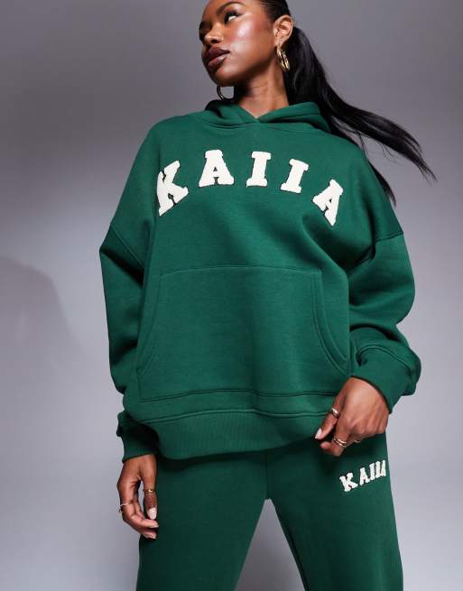 Kaiia - Skovgrøn hættetrøje med logo i imiteret lammeskind i oversized pasform - Del af sæt