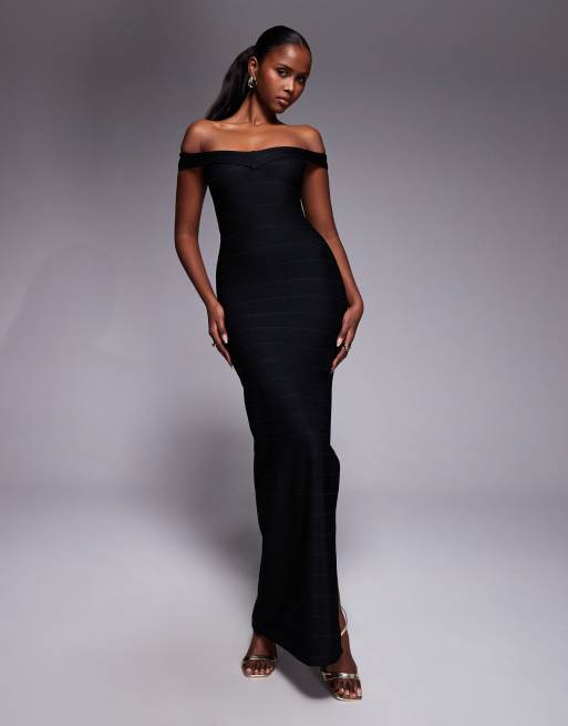 Kaiia - Sort bandage-maxikjole med bardot-snit og sideslids - Kun hos ASOS