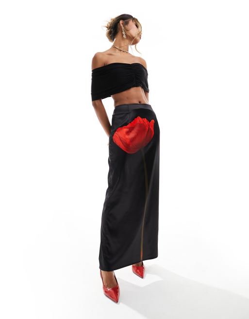 Kaiia - Sort maxinederdel med blomstermotiv i satin - Kun hos ASOS
