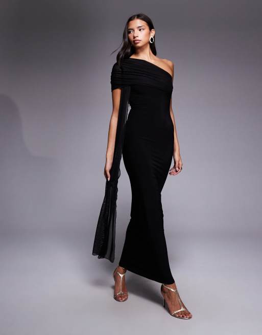 Kaiia - Sort og tætsiddende oneshoulder-maxikjole med draperet detalje i mesh med dobbeltlag - Kun hos ASOS