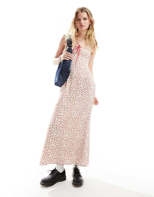 Kiss The Sky - Cremehvid og rød cami-maxikjole med sløjfedetaljer og småblomstret print