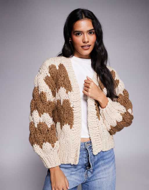 Kiwi & Co - Hugs & Kisses - Mokkabrun/brun håndstrikket cardigan med ballonærmer og striber i boblestrik