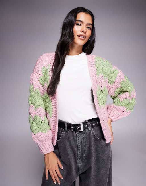 Kiwi & Co - Hugs & Kisses - Pink/limegrøn håndstrikket cardigan med ballonærmer i boblestrik