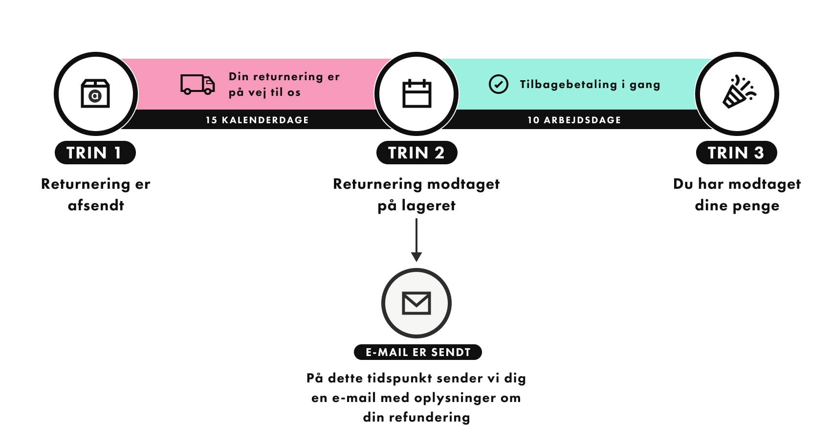 Sporing af returneringer, der viser, at pakken er leveret, men du har endnu ikke modtaget en e-mail? Vi har brug for den fulde tidsramme ovenfor for at behandle alle indgående returneringer, især i travle perioder.