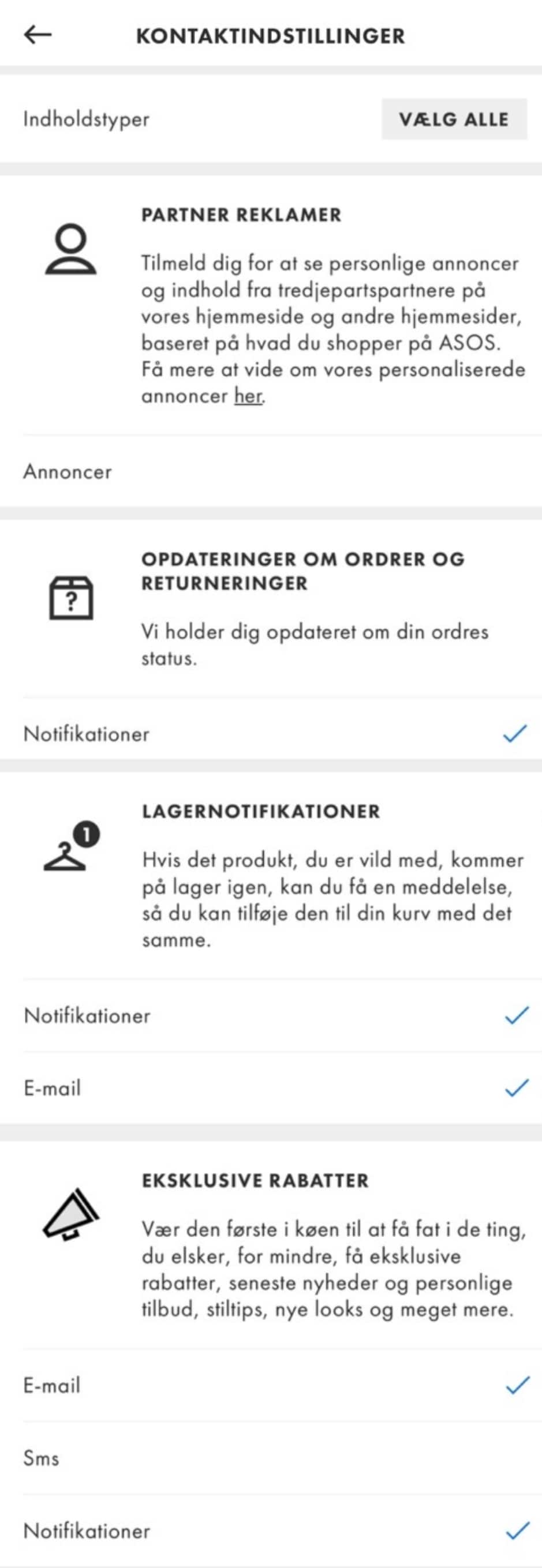 For at gøre dette skal du blot gå til 'Min konto' og vælge 'Notifikationer'. Når du er dér, kan du vælge at modtage notifikationer om lagerbeholdning, leverings- og returopdateringer samt rabatter og nye varer på din telefon. - Tjek din e-mailadresse.