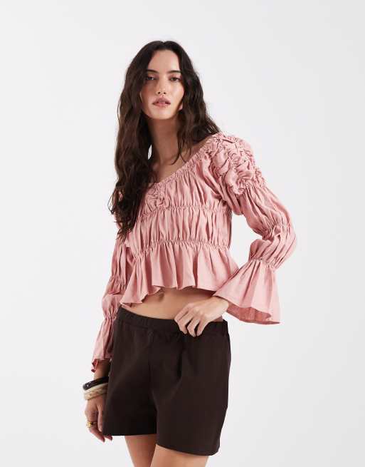Laagam - Sadie - Rynket lyserød offshoulder-bluse