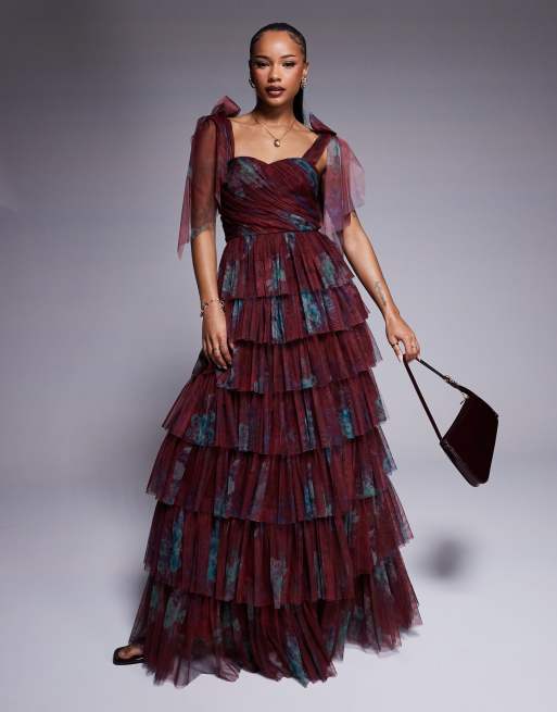 Lace & Beads Petite - Bordeaux lagdlet maxikjole med flæser og blomstermønster