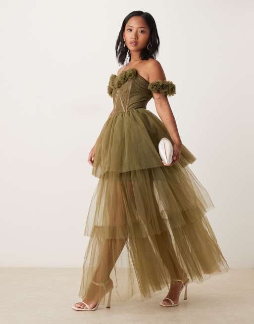 Lace & Beads Petite - Dyb olivengrøn korset-maxikjole med rosetter