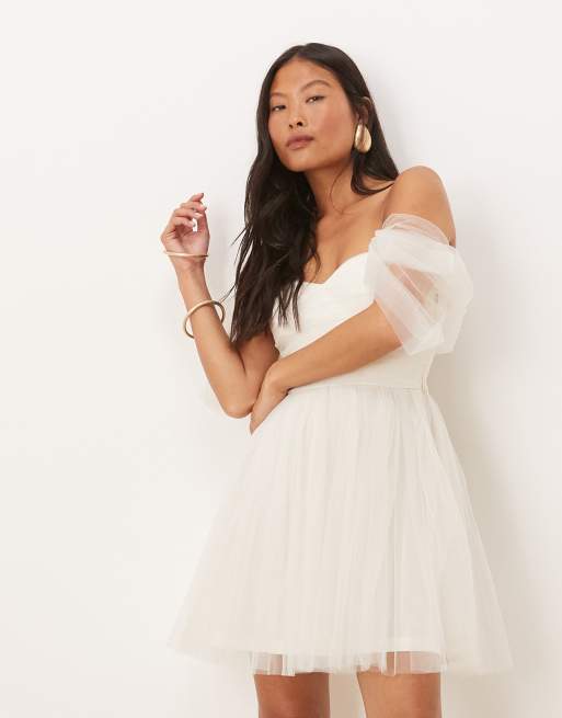 Lace & Beads Petite - Hvid offshoulder-minikjole i tyl