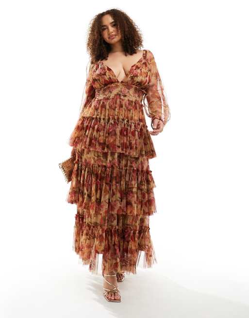 Lace & Beads Plus - Maxikjole i tyl med niveauinddelinger i rosenrødt blomstermønster