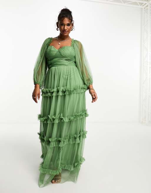 Lace & Beads Plus - Olivengrøn maxikjole med flæser og transparente ærmer