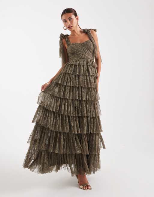 Lace & Beads - Brudepiger - Olivengrøn lagdelt maxikjole i blondestof med sløjfer på skuldrene