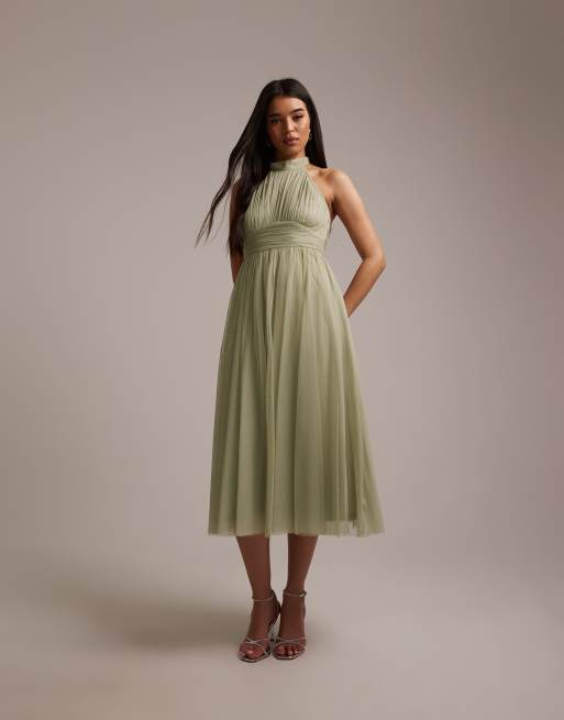 Lace & Beads - Brudepiger - Salviegrøn midikjole i tyl med halterneck