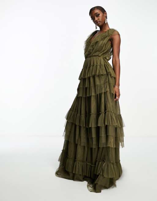 Lace & Beads - Lagdelt olivengrøn maxikjole i tyl