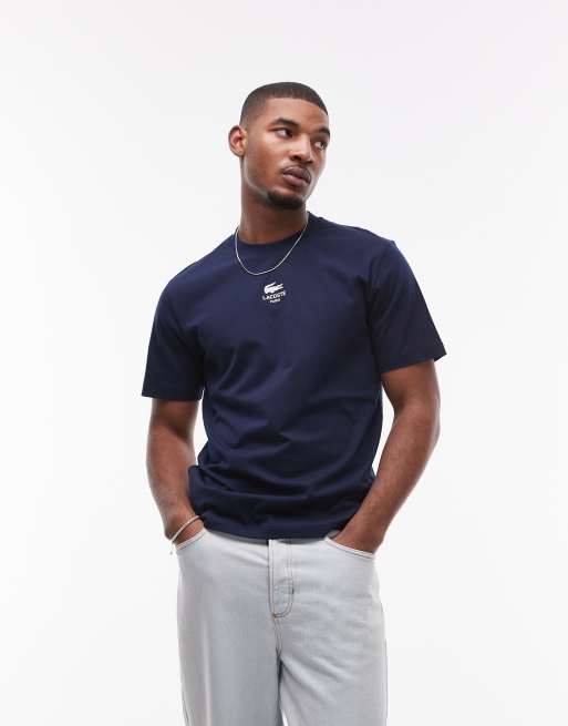 Lacoste - Marineblå T-shirt med lille, centralt logoprint i afslappet pasform