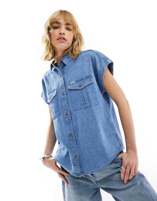Lee - Draperet denimskjorte med korte ærmer i lys vask