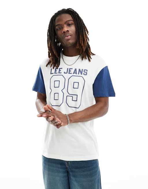Lee - Hvid og blå baseball-T-shirt med raglanærmer og college-logo