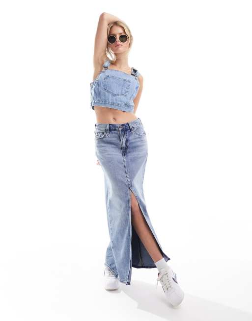 Levi's - Ankellang blå denimnederdel med frontslids og søjlesnit