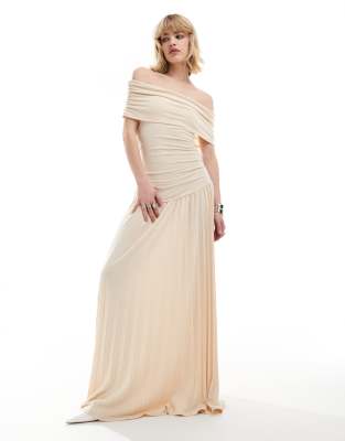 Lioness - Beige, strikket, rynket og plisseret bardot-maxikjole med sænket talje