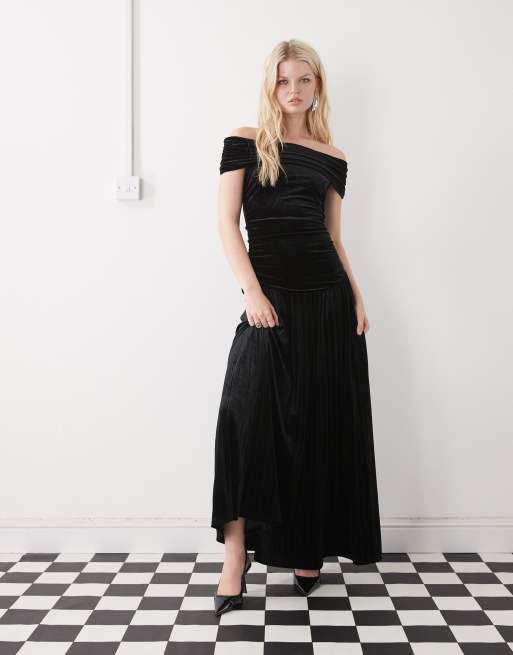 Lioness - Field of Dreams - Sort bardot-maxikjole med foldet detalje, sænket talje med rynker og plisseringer i velour