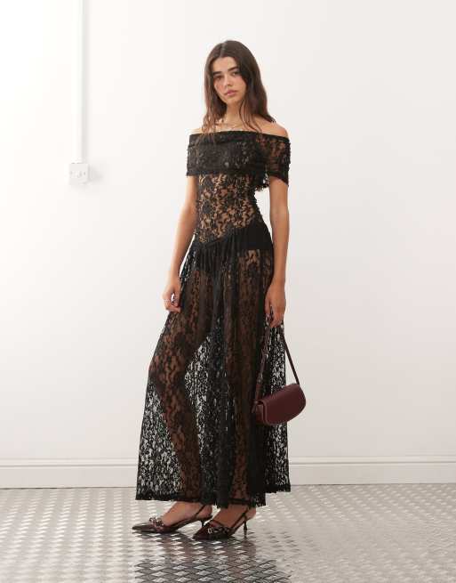 Lioness - Field of Dreams - Sort gennemsigtig blonde-maxikjole med foldet bardot-snit med rynker og sænket talje