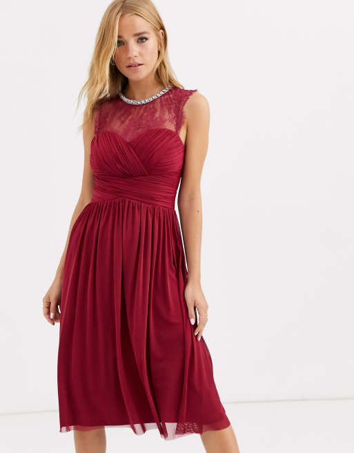 Lipsy - bær-farvet rynket midikjole med blonder og dekoreret hals