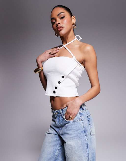 Liquor N Poker - Hvid og ribstrikket halterneck-top med nitter