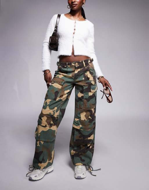 Liquor N Poker - Multifarvede posede jeans med lav talje, nittedetaljer og camouflage-mønster