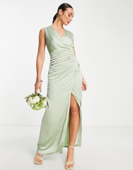Liquorish - Brudepiger - Salviegrøn maxikjole med slå-om-front i satin