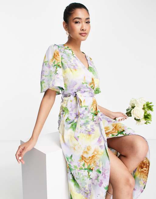 Liquorish - Midaxi-kjole med slå-om-front og sart pastelfarvet blomstermønster i satin