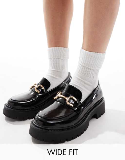 London Rebel Wide Fit - Perdy - Sorte chunky loafers med metaldetalje
