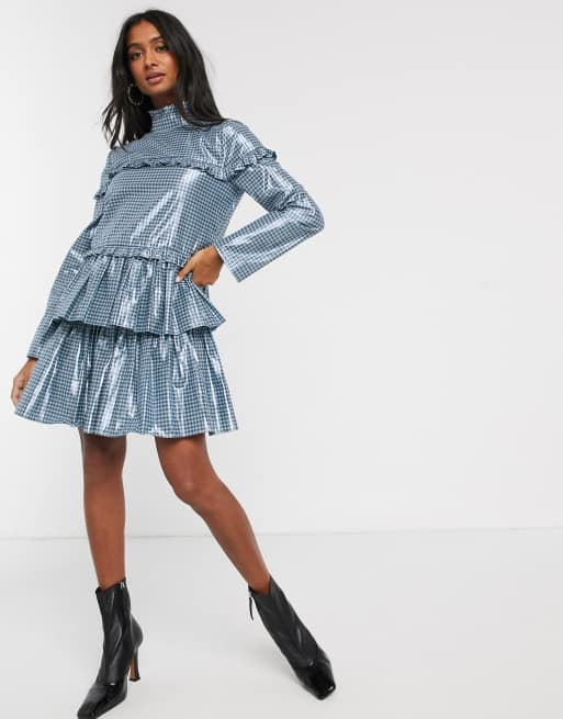 Lost Ink — Minikjole med flæser i metalfarvet ginghamstof