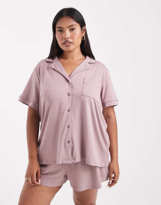 Loungeable Curve - Superblødt pyjamassæt i støvet grålilla jersey med kortærmet skjorte og shorts