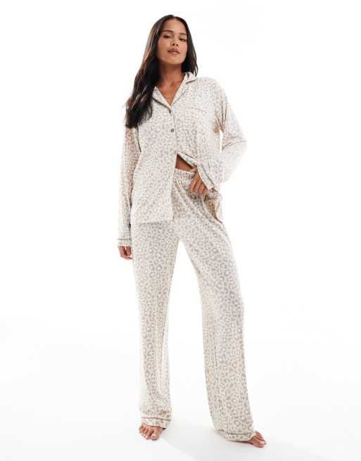 Loungeable - Neutralt pyjamassæt med top med reverskrave og kantdetaljer og bukser med vide ben og leopardprint i superblød jersey