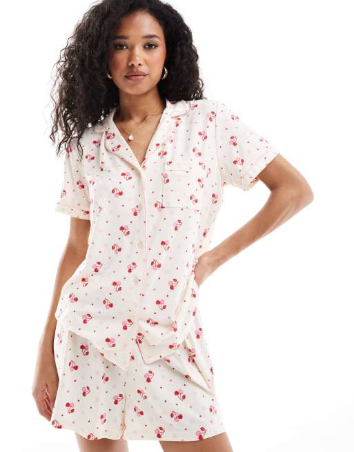 Loungeable - Pyjamassæt med shorts og top med reverskrave med kantdetaljer og kirsebær- og hjerteprint i superblødt jersey